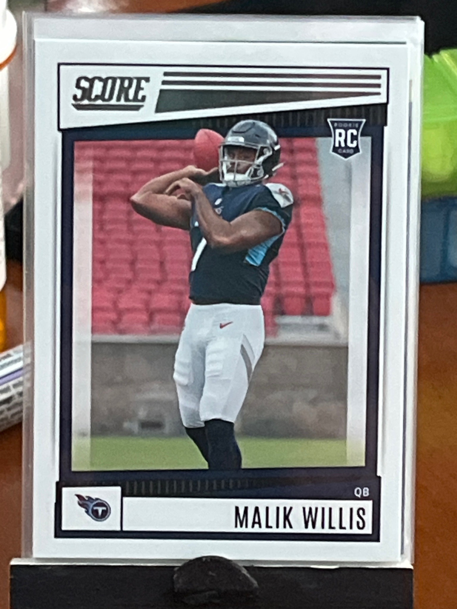This is a 2022 Panini Score football trading card featuring Malik Willis, the quarterback for the Tennessee Titans. The card is a standard 2.5-by-3.5 inch size, constructed on white cardstock with a semi-gloss finish. The front design utilizes a modern, geometric border in navy blue and black tones, showcasing an action photograph of Willis in a drop-back passing motion, wearing the Titans' dark blue home jersey and white pants. The word 'SCORE' is prominently displayed in the upper left corner within a stylized bar graphic. A 'Rookie Card' (RC) shield logo is positioned in the upper right corner of the internal image frame. The player's name, 'MALIK WILLIS', is printed in bold sans-serif black type at the bottom, accompanied by his 'QB' position and the Tennessee Titans team logo to the left. This card is currently housed in a protective soft plastic sleeve (penny sleeve) and a rigid top-loader protector. Visually, the card appears to have good centering, sharp corners, and clean white borders without significant edge wear or chipping. There are no obvious signs of surface scratching, creasing, or staining visible through the protective casing, suggesting it is in near-mint to mint condition.