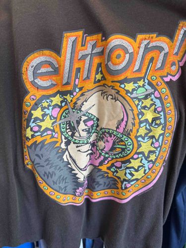 This item is a short-sleeved graphic t-shirt featuring a highly stylized caricature of the legendary musician Elton John. The central graphic is circular, bordered by orange and yellow dots, and depicts Elton John wearing his iconic oversized, glittery glasses with a starburst lens and a fur-trimmed robe. The name 'Elton!' is prominently displayed across the top in a bold, block-lettering style with a glitter effect texture. The background of the circular portrait is filled with yellow stars, pink accents, and a Saturn-like planet, evoking a space-age or 'Rocket Man' glam rock aesthetic. The garment is made from a charcoal gray or faded black cotton jersey fabric. The printing method appears to be screen printing with specialized shimmer or glitter ink on the lettering to mimic a 1970s aesthetic. Condition-wise, the garment shows signs of light wear with some minor cracking visible in the ink of the yellow stars and the orange border, which is typical for vintage-style graphic tees. There are no visible holes or major stains in the fabric shown. The style is indicative of modern 'vintage-wash' concert merchandise likely produced within the last 5-10 years, though it faithfully reproduces the 1970s pop-art style. Small copyright text is visible on the bottom right of the graphic, though the specific manufacturer name is illegible in the image.