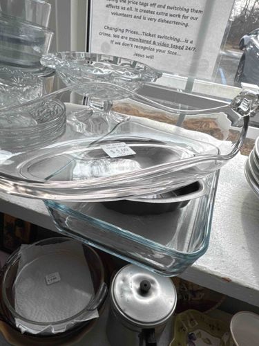This item is a two-piece clear glass bakeware set, prominently featuring an oval-shaped glass lid with a distinctive raised, stylized handle. The set is constructed from heavy-gauge, heat-resistant borosilicate or soda-lime tempered glass, characteristic of Mid-Century kitchenware manufacturers like Glasbake or Pyrex. The lid features sweeping, curvilinear lines and integrated glass handles on either end that curve upward. The lid rests upon a rectangular or slightly ovular deep clear glass baking dish. Physically, the glass exhibits a slight bluish-green tint when viewed through the thickest edges, indicating the iron content typical of vintage American-made glass. There is a visible white price sticker on the surface of the lid. The condition appears fair to good for a resale environment; however, there are noticeable surface scratches and shelf wear consistent with age and use. No major chips or cracks are immediately visible in the primary structure, though the edges of the handles show some light occlusion which may be grime or minor flea bites. The style is quintessentially 1950s-1960s American utilitarian design. While no maker's mark is legible from this angle, the handle profile is highly indicative of McKee/Glasbake designs from that era.