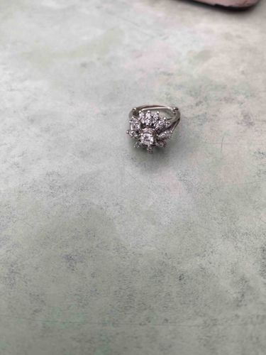 This item is a white metal ring, likely silver or white gold, featuring a complex floral or sunburst cluster setting. At the center of the ring sits a round-cut clear stone, which is surrounded by two concentric tiers of smaller, similarly colorless stones, possibly diamonds or cubic zirconia. These secondary stones appear to be set in individual prongs to create a petal-like or jagged starburst silhouette. The band of the ring has a split-shank style that broadens as it approaches the head of the setting, providing structural stability for the large central decorative element. The overall construction exhibits a Mid-Century to Contemporary aesthetic, often seen in cocktail rings designed for high visual impact. The metal appears polished but displays some minor surface micro-scratching indicative of light previous wear. No specific maker's marks or hallmarks are clearly visible in the provided perspective; however, the symmetry and prong work suggest machine-assisted hand-finishing. The color story is monochromatic, relying on the contrast between the reflective white metal and the faceted clear gemstones to catch light. To determine the exact value, a physical inspection of hallmarks on the inside of the band and a thermal conductivity test on the gemstones would be required.