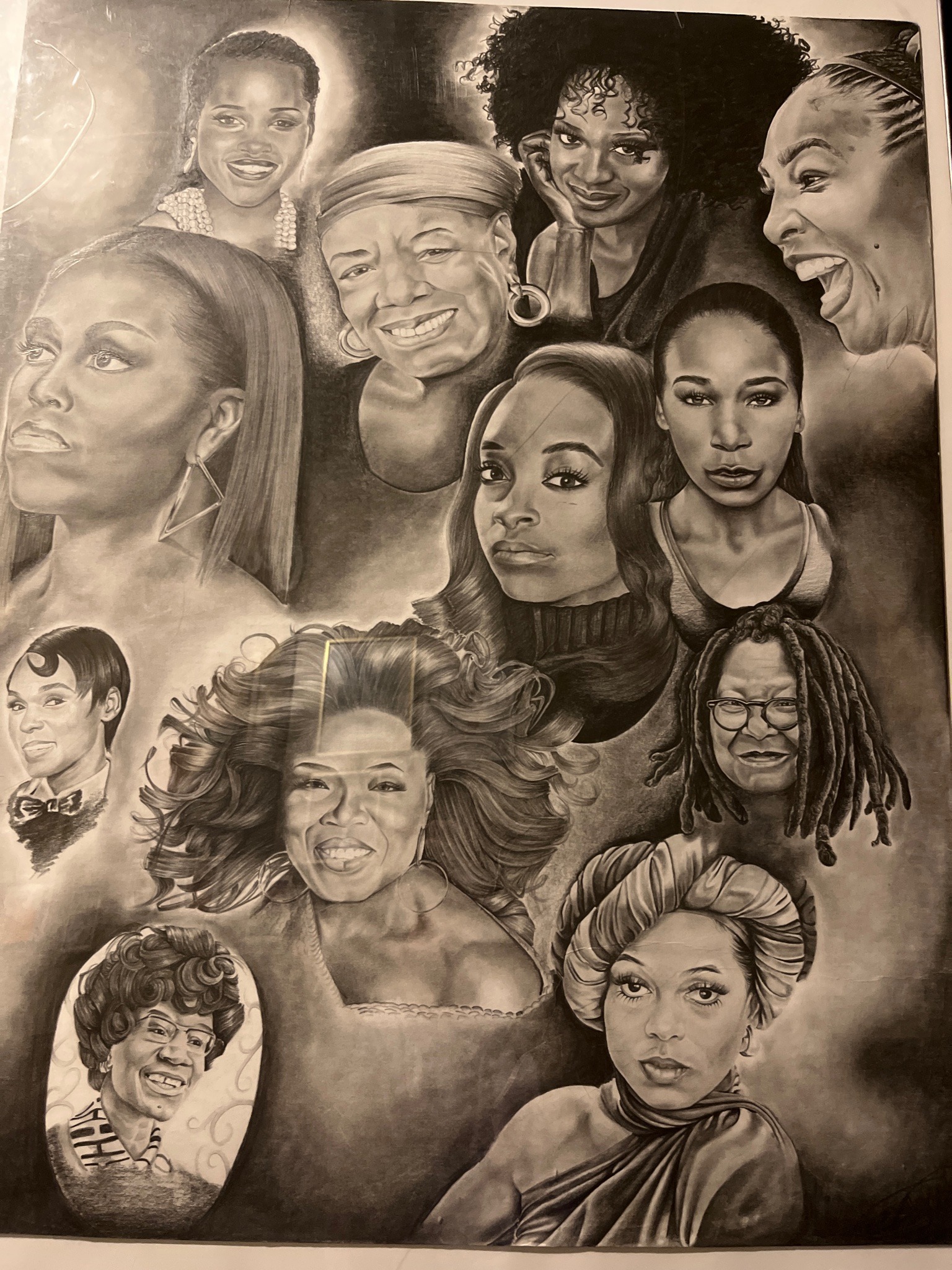 This item is a large-format monochromatic drawing, likely executed in charcoal, graphite, or conté crayon on paper. It features a collage-style composition of portraits depicting several influential Black women from the 20th and 21st centuries. Recognizable figures include Oprah Winfrey, Michelle Obama, Maya Angelou, Whoopi Goldberg, Janelle Monáe, Shirley Chisholm, and others. The artwork demonstrates a high level of technical skill in photorealistic rendering, with significant attention paid to the varying textures of hair, skin tones through chiaroscuro shading, and jewelry details like large hoop earrings and pearls. The subjects are arranged in an overlapping, non-linear fashion against a dark, smokey background that creates a dramatic light-source effect around the edges of each face. Regarding condition, the piece shows visible signs of structural wear. There is a prominent surface crease or slight tear in the upper left corner near the portrait of Lupita Nyong'o, and several horizontal and diagonal surface ripples across the mid-section, particularly through the face of Oprah Winfrey. These suggest the paper may have been stored rolled or has suffered from moisture-related cockling. No artist signature or date is immediately visible in the lower margins depicted. The style is contemporary realism, likely produced within the last ten to fifteen years (Post-2010) given the inclusion of recent public figures. The quality of the blending suggests a professional hand, focusing on emotional presence and tribute-art aesthetic.