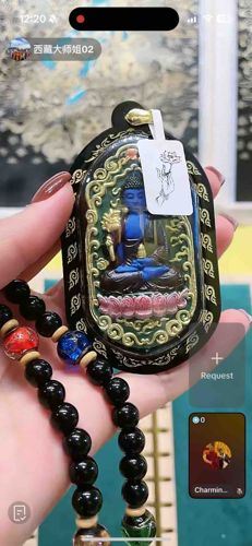 This item is a decorative Buddhist pectoral pendant (Gadu) depicting Bhaisajyaguru, also known as the Medicine Buddha. The central figure is rendered in a deep lapis lazuli blue, seated in a meditative dhyana mudra upon a pink and white lotus throne. The Buddha holds a bowl of healing nectar, and the figure is set against a vibrant green background, encased in an ornate golden scrolled border. The pendant is housed in a black protective teardrop-shaped casing, which is further embellished with gold-tone Buddhist cloud or wave patterns around its edge. The casing appears to be made of a modern resin or acrylic with a clear protective window. Attached to the top is a gold-tone metallic bail. Included with the pendant is a string of mala beads consisting primarily of polished black obsidian or glass beads, interspersed with decorative red and blue lampworked glass focal beads. A white tag with a lotus line drawing indicates this is a retail item, likely of contemporary manufacture. The craftsmanship shows mass-produced qualities with crisp, stencil-like gold detailing on the outer frame. The condition appears new or excellent with no visible wear, chips, or patina, suggesting it is a modern spiritual accessory rather than an antique artifact.