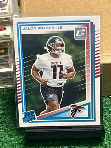 This is a standard-sized modern sports trading card (approximately 2.5 by 3.5 inches) featuring Jalon Walker, a linebacker for the Atlanta Falcons. The card is part of the prestigious Panini Donruss 'Rated Rookie' series, an iconic branding in the sports card hobby. The design features a white border framing a multi-layered blue and red graphic layout that surrounds a high-resolution central photograph of the player in his Atlanta practice uniform. The card includes several key branding elements: the 'Rated Rookie' logo in the bottom-left corner, the 'Donruss' brand logo in the upper-right, and the Atlanta Falcons team logo in the bottom-right. The player's name and position are clearly printed across the top margin. The card is constructed from stiff cardstock with a glossy finish on the surface. Visually, the card appears to be in excellent to near-mint condition, housed within a protective clear plastic sleeve and top-loader. The centering appears well-balanced, and the corners look sharp through the plastic with no obvious surface abrasions or manufacturing defects visible. This item represents a modern collectible from the 2020 era of NFL trading cards, specifically appealing to team collectors and rookie card investors.