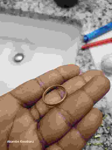 This item is a minimalist circular band, likely used as a ring, appearing to be crafted from a metallic material with a distinct warm hue consistent with copper, bronze, or rose gold plating. The band is thin and uniform in thickness, featuring a smooth, polished interior and exterior surface. Its construction is simple and continuous, suggesting a modern or contemporary production. The color is a characteristic reddish-orange brown, showing some subtle reflections that indicate a metallic sheen. Notable physical qualities include its small diameter relative to the human hand holding it, likely intended for a standard finger size. Regarding condition, the metal surface does not show immediate deep gouges or heavy tarnish in the low-resolution view, though a fine patina or slight surface oxidation may be present, which is typical for copper-based alloys. There are no visible maker's marks, hallmarks, or decorative engravings discernable in the image. The craftsmanship appears clean and functional, lacking the ornate details of high-jewelry pieces, pointing toward everyday wear or a costume jewelry classification. The style is timeless and utilitarian, often associated with a 'wedding band' aesthetic or a stackable accessory ring.