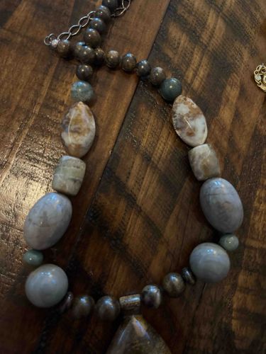 This is a substantial statement necklace composed of various polished semi-precious stone beads, primarily varieties of agate and quartz. The piece features a graduated design with a large triangular pendant at the center (partially visible). The beads exhibit a diverse palette of earth tones, including steely grays, translucent tans, cream marbled with brown, and muted sage greens. The construction utilizes several bead shapes: large smooth ovals, faceted rectangular barrels, and smaller spherical accent beads. The necklace is strung on a durable cord and finished with a silver-toned metal lobster claw clasp and an extender chain, allowing for adjustable length. The natural stones show characteristic internal inclusions and banding typical of cryptocrystalline quartz. The condition appears to be excellent with a high-polish finish on all stones; no visible chips or cracks are noted in the image. This style of 'bold earthy' jewelry is characteristic of late 20th-century to contemporary artisanal design, prioritizing the raw aesthetic of natural minerals. The craftsmanship is evidenced by the careful selection of complementary textures and the secure finishing of the metallic findings.
