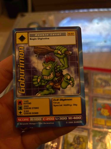This is an original English-language Digimon Digi-Battle Trading Card featuring the character 'Goburimon'. The card is specifically identified as 'St-67' in the upper right-hand corner. The artwork depicts a green, goblin-like creature with a red mohawk brandishing a wooden club against a blue grid background. The layout features the standard 1999-2000 Bandai design including a blue border, character name vertically on the left, and stat boxes at the bottom. Notably, it lists power levels for 'Goburi Strike' and 'Goburi Bomb' and categorizes the monster as an 'Evil Digimon' with the 'Virus' attribute. The bottom copyright text attributes the material to Akiyoshi Hongo, Toei Animation, and Bandai 2000. Physically, the card appears to have moderate corner wear and some whitening along the edges, common for a circulated card of this age. The surface shows a slightly matte finish typical of early starter set printings rather than a holographic foil. The centering appears slightly shifted to the left, which is a common manufacturing variance for Bandai cards of this era. Overall, it serves as a nostalgic specimen from the peak of the Digimon franchise's initial western release.