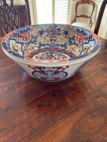 This is a large, circular porcelain punch bowl traditionally decorated in the 'Imari' style. The color palette is characteristic of the genre, utilizing underglaze cobalt blue paired with overglaze iron red and accented with gold leaf or gilt highlights. The interior is densely decorated with a central roundel featuring a floral vase, surrounded by radiating panels and scrolling botanical motifs. High-quality craftsmanship is evidenced by the fine line-work and the complexity of the repeating geometric and floral patterns along the inner rim. The exterior showcases large cartouches with scalloped borders, containing stylized blossoms and scrollwork. Based on the uniform shape and the vibrancy of the pigments, this piece appears to be a 20th-century revival or export-style item, likely dating to the Showa era or late Meiji period. The glaze displays a clean, reflective sheen, suggesting it has been well-maintained. There are no immediate signs of significant structural damage such as cracks or large chips visible in the photograph, though minor surface wear to the gilt on the rim is common for a piece of this age. The bowl serves as a significant decorative centerpiece, reflecting the historical Japanese porcelain traditions meant for the Western market.