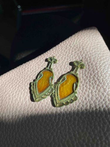 This is a pair of vintage decorative pendants, likely originally components of a larger piece of costume jewelry like a necklace or statement earrings. The pieces measure approximately 1.5 to 2 inches in length and are constructed from a cast brass-tone alloy metal with an aged, greenish-brown bronze patina. The design is heavily characteristic of the Art Nouveau period, featuring teardrop-inspired shapes, scrolling organic lines, and stylized floral motifs at the neck of each piece. Each pendant features a central translucent amber-colored insert, which appears to be poured glass or high-quality resin, designed to mimic the appearance of natural honey amber. The metal frame shows significant oxidation and surface wear, indicating substantial age. There are no visible maker's marks on the front, and the back is not shown, though the small jump rings at the top are original attachment points. The level of detail in the casting—specifically the beaded edges and recessed grooves—suggests mass-production from the early to mid-20th century. While they display cosmetic wear and verdigris, they retain structural integrity and represent a classic example of transitional Arts and Crafts or Art Nouveau-style commercial jewelry components.