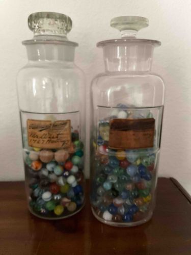 This lot consists of two vintage clear glass apothecary or apothecary-style display jars, each filled with a variety of glass toy marbles. The jars feature a cylindrical body with a flared rim and are topped with original ground-glass stoppers that vary in shape—one exhibiting a faceted, knob-like design and the other a flat, disc or button-like form. The center of each jar contains an applied rectangular label, aged to a deep tan or brown patina. One label clearly displays handwritten script mentioning '1967', suggesting a mid-20th-century provenance. The interior contents comprise a dense assortment of marbles in varying sizes, colors, and styles, including cat's eyes, solid colors, and swirled patterns in shades of blue, green, red, yellow, and white. The glass remains largely transparent with some minor surface dust and natural aging seen on the adhesive of the labels. The craftsmanship of the jars points to a utilitarian medical or pharmaceutical origin converted for decorative use. Overall condition appears good with historical wear consistent with age, particularly the discoloration and fraying of the paper labels which adds to the antique aesthetic.