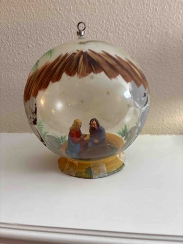 This is a large-format vintage spherical Christmas ornament featuring a hollow glass diorama interior. The piece is constructed from thin, blown glass with an iridescent or pearlescent finish on the exterior shell. Inside the spherical cavity is a miniature Three-Piece Nativity scene featuring Mary, Joseph, and the infant Jesus in a manger, molded from plastic or resin and hand-painted with muted blues, reds, and browns. The top of the sphere includes an outer hand-painted brown thatched roof motif, creating a stable atmosphere. The background is embellished with small gold star decals. The ornament is mounted on a wide, circular base painted in yellow and green tones, which shows visible adhesive or tape residue around the circumference, suggesting a previous repair or reinforcement. At the apex is a standard metal loop for hanging. The style and construction point towards a mid-to-late 20th-century manufacture, likely European or American. Condition issues include significant adhesive staining on the base, minor paint loss on the exterior stable roof, and potential age-related yellowing of the internal components. The craftsmanship shows a combination of mass-production and hand-finishing common for mid-century holiday decor.