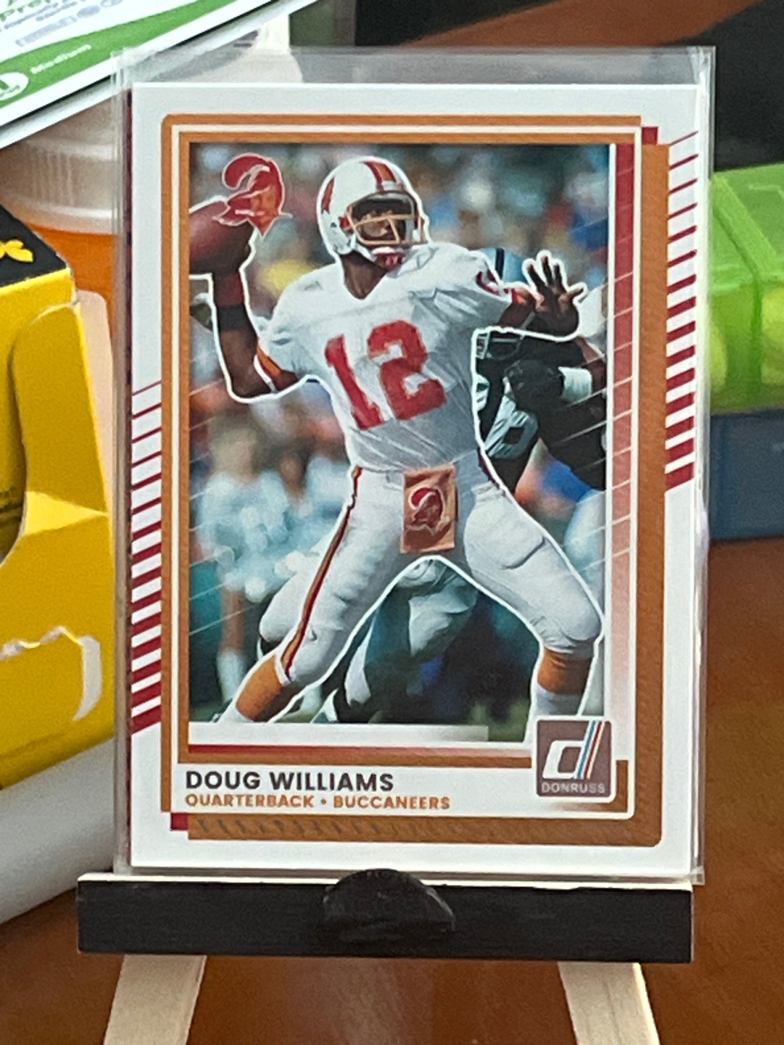 This is a 2021 Donruss football trading card featuring Doug Williams of the Tampa Bay Buccaneers, designed with a vintage 'Retro Series' aesthetic that pays homage to classic 1980s card designs. The card displays Williams in his iconic white and orange 'Creamsicle' era uniform, capturing him in a dynamic throwing motion. The physical construction is standard cardstock with a glossy finish on the front. It features a distinctive bronze-colored textured border with white diagonal pinstripe accents on the sides. The 'Donruss' brand logo is clearly visible in the lower right corner, and the player's name, position, and team are printed in a clean sans-serif font along the bottom margin. The card is currently housed in a clear protective sleeve (penny sleeve) and displayed on a miniature wooden easel. Regarding condition, the card appears to be in near-mint to mint condition with sharp corners and clean edges visible through the sleeve. There are no signs of surface scratches, creasing, or discoloration typical of older cards, as this is a modern production. The centering of the image within the bronze border appears balanced, further enhancing its visual appeal for collectors of both modern sports memorabilia and historical NFL figures.