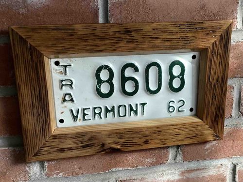 This item is a decorative piece featuring an authentic 1962 Vermont trailer license plate (registration number TRA 8608), presented in a high-quality, custom-made frame. The license plate exhibits a classic white background with dark green embossed lettering, characteristic of Vermont's mid-century aesthetic. It shows genuine signs of age, including significant crazing or 'spiderwebbing' of the original paint across the numbers, light surface oxidation near the mounting holes, and minor staining, which contribute to its vintage character. The plate is professionally mounted within a frame crafted from reclaimed century-old barnwood sourced from an Art Johnson-owned cattle barn in Arlington, Vermont, which was dismantled in 1981. The woodwork demonstrates superior craftsmanship, utilizing mitered corners reinforced with structural splines on the 45-degree angles for both integrity and visual appeal. The frame features a deep, honey-toned grain with natural pockmarks and historical weathering preserved under multiple protective coats of glossy polyurethane. This combination of automobilia and regional architectural history makes it a unique piece of folk-art repurposing, connecting Southern Vermont's agricultural past with its transportation history.