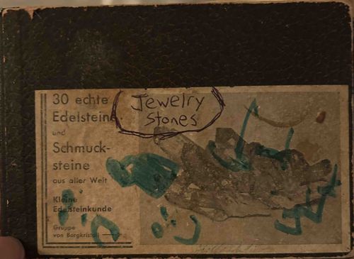 This item is a vintage German mineralogical specimen collection box, specifically titled '30 echte Edelsteine und Schmucksteine aus aller Welt' (30 Genuine Gemstones and Decorative Stones from Around the World). The box features a dark, textured leatherette or pebble-grained hard cover, common in the mid-20th century. A paper label is adhered to the front, displaying German text and a graphic illustration of quartz crystals. The manufacturer is likely a scientific or educational supplier, possibly related to the 'Kleine Edelsteinkunde' series. The condition is poor to fair, showing significant secondary intervention. The cover exhibits corner bumping and edge wear. Most notably, the original label has been heavily defaced with blue and green ink scribbles, and the phrase 'Jewelry Stones' has been handwritten in black ink within a hand-drawn circle. This suggests the item was used as a teaching tool or owned by a child. Despite the external damage, such items traditionally contain small, glued-in polished or raw mineral specimens behind the cover. Based on the typography and materials, it likely dates from the 1950s to 1970s. The craftsmanship of the original box indicates a standard mass-produced educational product for mineral enthusiasts.