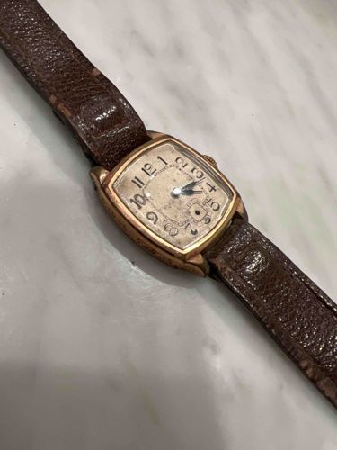 This is a vintage tonneau-shaped wristwatch featuring a rose-tone or gold-tone cushion case design, likely dating from the 1920s to 1930s. The watch face exhibits a cream or off-white dial with stylized Art Deco Arabic numerals. It includes a sub-second dial at the 6 o'clock position (partially obscured) and blued steel Cathedral-style hands. The case shows significant wear, with visible tarnishing, pitting, and oxidation consistent with its age, possibly indicating a gold-filled or plated composition. The dial displays a heavy patina with spotting and discoloration across its surface. It is mounted on a worn, dark brown textured leather strap that appears to be a later replacement, showing significant cracking and dryness. The crown is located at the 3 o'clock position and appears original. The overall construction suggests an early mass-produced mid-tier timepiece from the early 20th century. Measurement appears to be approximately 25-30mm in width, typical for men's watches of that era, which are now considered mid-size or unisex.