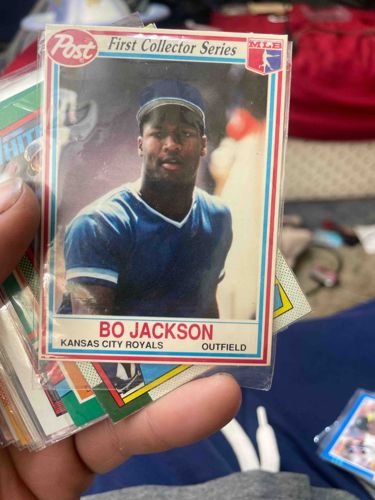 This is a standard-sized trading card (approximately 2.5 by 3.5 inches) featuring multi-sport legend Bo Jackson during his tenure with the Kansas City Royals. The card was a promotional item distributed within Post Cereal boxes in 1990, designated as part of the 'First Collector Series.' The design features a centered color photograph of Jackson in a blue Royals jersey and cap against a blurred background. The card is bordered by a blue and red multi-line frame. The 'Post' logo is prominently displayed in a red oval in the top left corner, while a red MLB logo appears in the top right. At the bottom, the player's name 'BO JACKSON' is printed in bold red uppercase letters, with 'KANSAS CITY ROYALS' and 'OUTFIELD' printed in blue below. Regarding condition, this specimen appears to be stored in a clear plastic protective sleeve. The centering appears slightly skewed toward the bottom right. The corners show some minor softening, which is typical for cereal box inserts that often sustained damage during the packaging process. The colors remain vibrant with no significant fading visible. There are no obvious creases or surface tears visible through the sleeve, though minor surface wear is common for the semi-glossy card stock used by Post in this era. This set is notable for being the first major cereal set produced by Post in decades, making it a staple of late-80s/early-90s 'junk wax' era memorabilia.