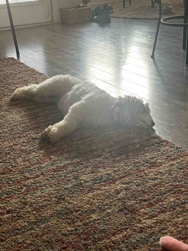 This living biological specimen is a medium-sized canine, likely a Poodle-mix (commonly known as a 'Doodle'). The animal exhibits a dense, curly, and fleece-like coat in a monochromatic cream or off-white hue. Physically, the dog is positioned in a relaxed, lateral recumbent pose on a textured rug. Key attributes include a slender muzzle, long-limbed proportions, and floppy ears covered in ringlet-style fur. The coat appears healthy with a natural sheen, though the paws show slight discoloration consistent with routine outdoor activity. No visible collar or identifying tags are prominent in the profile view, suggesting a domestic indoor environment. The specimen appears to be in its adult stage of life, characterized by its size and muscle tone. The overall condition suggests a well-maintained pet with high-quality grooming, as evidenced by the lack of significant matting in its high-maintenance curly fur. The lighting in the photo highlights the soft texture of the 'craftsmanship' of nature, presenting a peaceful and sedentary temperament.