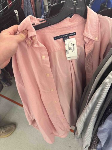 This is a Ralph Lauren Sport branded long-sleeved button-down shirt, characterized by its classic pink or light salmon hue and oxford weave construction. The garment features a button-down collar with white pearlized buttons, which also run down the front placket. Crafted from 100% cotton, the fabric displays the typical textured 'basketweave' appearance associated with traditional oxford cloth, suggesting durability and breathability. The neck area contains the distinctive 'RALPH LAUREN SPORT' navy blue woven label with white uppercase lettering, indicating a piece from the brand's mid-range casual athletic line. The shirt appears to be sized 'S' (Small) according to visible sizing tags. Condition-wise, the shirt is pre-owned and currently located in a retail thrift or second-hand environment, as evidenced by the plastic price tag attached to the inner label. The fabric shows minor signs of wash wear and slight wrinkling consistent with storage on a rack. There are no immediate signs of significant staining, fraying, or structural damage visible in the primary view. The style is classic Americana, likely dating from the late 1990s to the 2010s, reflecting a timeless preppy aesthetic with reinforced stitching at the stress points and a standard box pleat on the back for comfort.