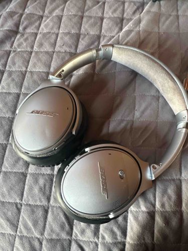This item is a pair of Bose QuietComfort 35 II over-ear noise-cancelling headphones in a silver metallic finish. The construction features plastic earcups with an integrated pivoting frame, a fabric/Alcantara-lined headband for comfort, and synthetic protein leather earpads. The exterior of each earcup prominently displays the 'BOSE' brand logo in raised lettering. Key physical features include a power/Bluetooth toggle switch on the right earcup, along with micro-perforated microphone grilles for noise cancellation and voice pickup. The headband is adjustable and utilizes a metal reinforcing band hidden within the padding. Regarding condition, the headphones show significant signs of heavy use and wear. The Alcantara lining on the underside of the headband is visibly soiled and discolored. The synthetic leather on the earpads is cracked and peeling (flaking), which is common for this model over time. There are minor scratches and scuffs on the silver plastic housing of the earcups. These headphones were originally manufactured by Bose Corporation between 2017 and 2021. Despite the cosmetic wear, the structural integrity appears intact, though the pads would require replacement for hygienic and aesthetic restoration.