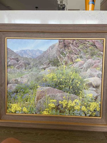 This item is a framed landscape painting attributed to the artist G. Zucconi, depicting a serene desert scene under a soft, daylight sky. The composition features a foreground dense with vibrant yellow wildflowers and sage-green desert scrub, transitioning into mid-ground granite boulders and jagged rock formations. In the distance, pale blue mountain peaks are visible, suggesting a location such as the Sonoran or Mojave Desert. The artwork appears to be executed in oil or acrylic on canvas, characterized by a realistic style and a soft color palette dominated by earthy ochres, dusty purples, and muted greens. The piece is housed in a contemporary, wide-profile wooden frame with a greyish-brown wood grain finish and a thin gold-toned inner fillet that provides a subtle decorative accent. While the frame appears to be in good modern condition with no major chips or structural damage, the painting's surface shows consistent color saturation and no immediate signs of cracking (craquelure) or paint loss. The quality of the brushwork is fine, demonstrating a skilled hand in capturing the varied textures of stone and flora. Based on the framing style and artistic execution, the piece likely dates from the late 20th to early 21st century.