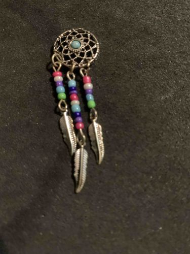 This item is a decorative dreamcatcher pendant, likely intended for use as a charm, earring component, or necklace element. The circular top section features a silver-toned filigree web pattern with a small faux-turquoise bead set at the center. Suspended from the base are three dangles of differing lengths, each composed of small, colorful seed beads in various hues including pink, blue, purple, white, and green. Each beaded strand terminates in a small, stamped metal feather charm with detailed line work representing the barbs of the feather. The metal appears to be a basic cast alloy, such as pewter or silver-plated base metal, showing a dark antiqued patina in the recessed areas. There are visible signs of wear consistent with costume jewelry, specifically minor oxidation on the jump rings and slight surface scratches on the metal feathers. The construction is assembly-based rather than high-end artisan craft, suggesting a modern production era, likely late 20th to early 21st century. The overall condition is fair to good, with all components intact but showing signs of mass-production quality rather than fine jewelry standards.