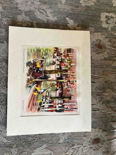 This item is a matted lithographic print of a watercolor painting by the renowned American artist Dong Kingman, depicting a vibrant scene of Fisherman's Wharf in San Francisco. The artwork showcases Kingman's signature mid-century modern style, blending traditional Chinese ink techniques with Western watercolor sensibilities. The composition features rhythmic brushstrokes and a bustling harbor aesthetic with various nautical vessels and dockside architecture in a diverse color palette of ochre, crimson, and deep blues. The print appears to be on a heavy paper stock, likely dating from the mid-20th century, approximately 1950s-1960s. Notable inscriptions on the left margin include 'Fisherman’s Wharf, San Francisco' and 'Dong Kingman'. The piece is professionally mounted in a wide, off-white textured mat. Condition-wise, the matting shows some minor foxing and light staining, particularly on the right-hand side, suggesting age and exposure to humidity. The print itself exhibits some slight toning consistent with vintage paper but maintains vibrant pigmentation. The craftsmanship reflects the era's movement toward stylized representational art, emphasizing lively urban environments with expert control of light and movement.