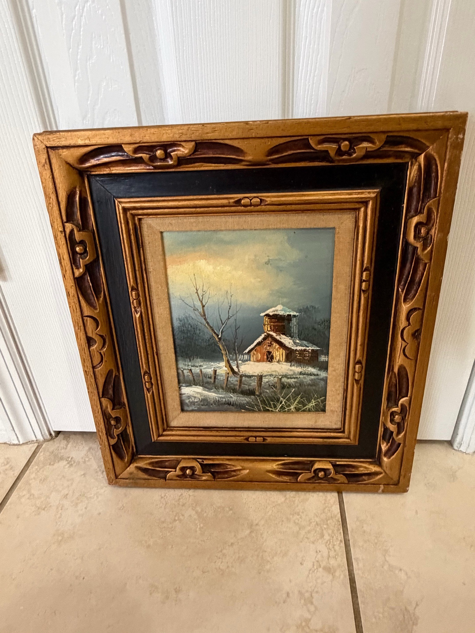 This item is an original oil painting on canvas board or wood panel, depicting a serene winter landscape featuring a snow-covered rustic barn with a silo, a leafless tree, and a wooden fence. The color palette is dominated by cool blues, whites, and greys in the landscape, contrasted by the warm browns of the barn and a luminous pale yellow sky suggest sunset or sunrise. The artwork is housed in a highly decorative, multi-tiered frame measuring approximately 12x14 inches. The frame construction includes an outer gilded wood layer with scalloped, carved floral motifs and scrolls, an inner matte black wooden bevel, followed by a natural linen-textured liner and a final gold-leaf inner fillet. The painting technique shows confident brushwork with visible impost techniques used for the snow. While no clear signature is visible in the provided photo, the style is characteristic of mid-20th-century decorative American regionalist art, likely dating from the 1960s to 1980s. Condition-wise, the frame shows substantial chipping and finish loss at the bottom-right and top-left corners, revealing the white gesso or plaster beneath the gold leaf. The linen liner shows minor discoloration and age-related yellowing. The painting surface appears stable with minimal visible cracking, though there is a light layer of surface dust consistent with long-term display.