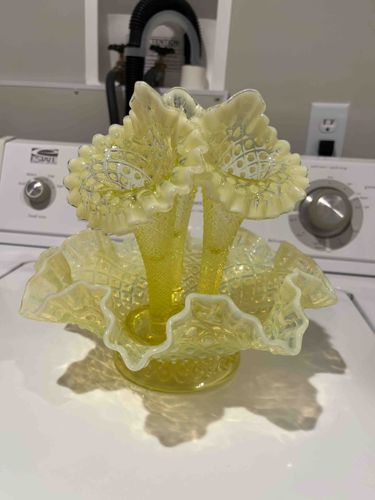 Fenton Topaz Opalescent Vaseline Glass Hobnail Epergne