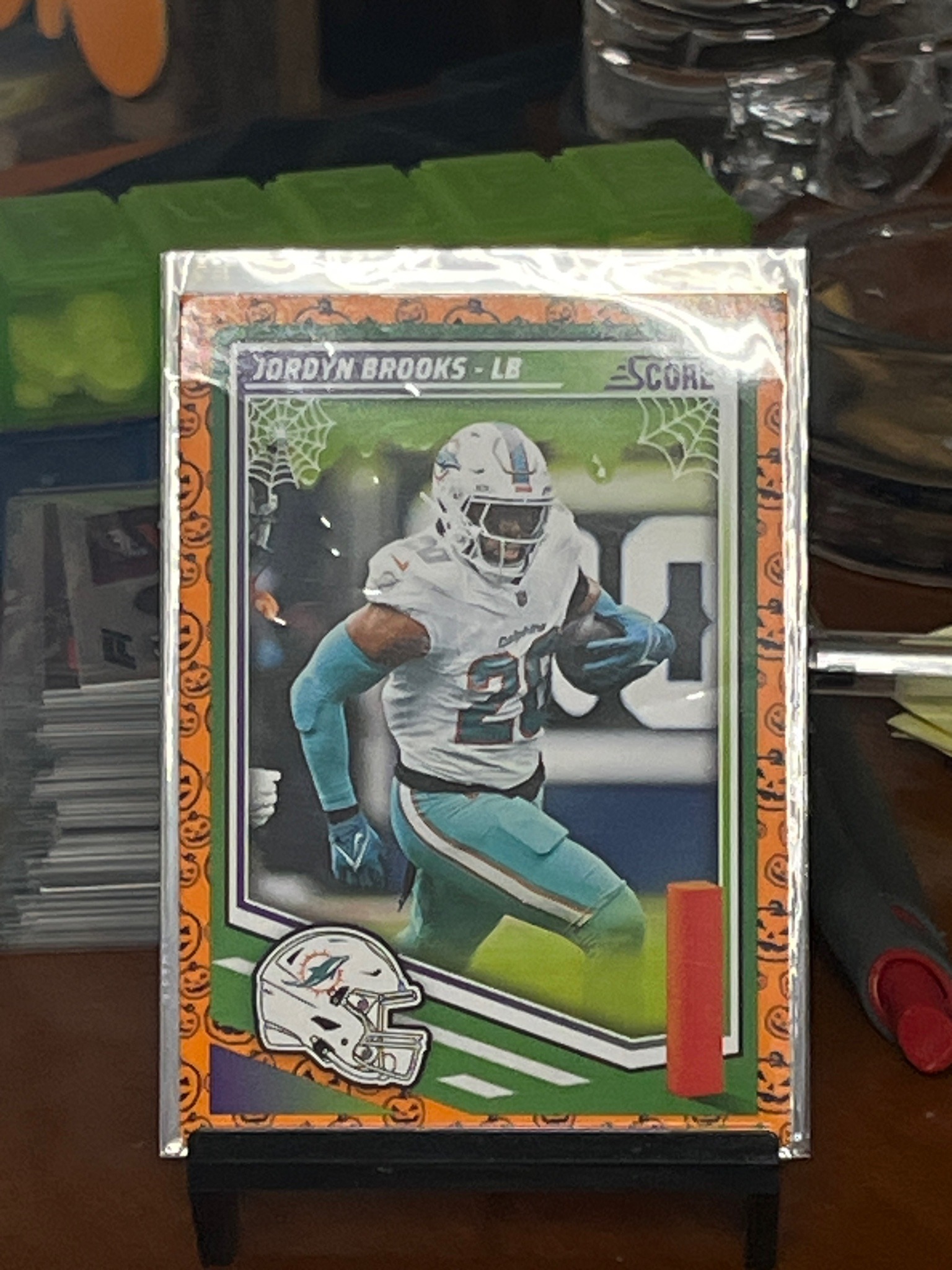 This is a 2024 Panini Score football card featuring Jordyn Brooks, linebacker for the Miami Dolphins. The card is a themed 'Pumpkin' parallel, characterized by a vibrant orange border densely patterned with repeating jack-o'-lantern illustrations. The central image depicts Brooks in his white Dolphins jersey and teal pants, capturing him in an action pose. Special design elements for this seasonal variation include white spiderwebs in the upper corners and a slime-green background gradient within the main frame. The player's name and position are located in the top left header, while the 'Score' brand logo is in the top right. A stylized Dolphins helmet icon appears in the bottom left corner. The card construction is standard glossy cardstock, measuring approximately 2.5 by 3.5 inches. The item is currently housed in a protective clear plastic sleeve and a rigid top-loader, resting on a small black display stand. Based on visual inspection through the plastic, the centering appears decent, though the orange border is wider on the left side than the right. The corners appear sharp and the surface glossy, with no visible creases or significant edge wear, suggesting a high-grade condition typical of modern collectibles straight from the pack.
