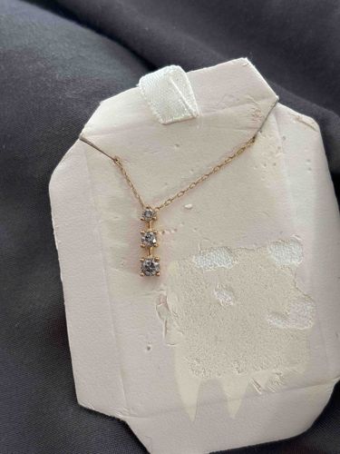 This jewelry piece consists of a 10k yellow gold pendant and an integrated fine link chain. The pendant features a classic 'Journey' style vertical drop design, set with three round brilliant-cut diamonds. Based on the provided context, the diamonds have an estimated total carat weight (TCW) of 0.25 carats. The diamonds are graduated in size, appearing to slightly increase in diameter from the top stone to the bottom stone, which is a symbolic representation of a relationship's growth. Each diamond is secured by a traditional four-prong setting, allowing for maximum light exposure through the sides and pavilion of the stones. The chain is a delicate cable-style link, matching the 10k yellow gold composition of the pendant. Regarding its condition, the piece appears to be in good used condition; the gold displays a soft, authentic yellow hue with minimal surface oxidation. There are no visible chips or heavy fractures in the gemstones from the provided perspective, though microscopic wear consistent with age is expected. The metal features thin, elegant construction typical of late 20th-century to early 21st-century commercial fine jewelry. While maker's marks or 10k hallmarking are not clearly legible in the photograph, the context indicates a standard purity level used in durable, everyday luxury goods. This style is highly popular for anniversary or sentimental gifting, characterized by its minimalist aesthetic and vertical symmetry.