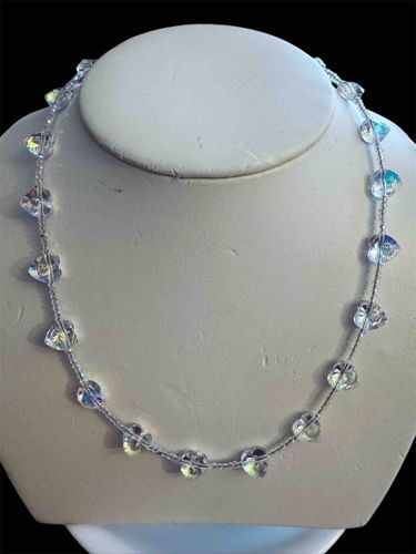 This is an elegant princess-length necklace featuring genuine Swarovski crystal components. The design is composed of thirteen faceted crystal heart pendants, each measuring approximately 10mm to 12mm. These hearts feature the Aurora Borealis (AB) coating, which displays a shimmering rainbow-like iridescence when light strikes the facets. The heart focal points are separated by a continuous strand of delicate, clear faceted rondelle crystal spacer beads. This construction suggests a hand-strung assembly, likely on high-quality jewelry wire or silk thread. The piece finishes with a sterling silver clasp, as noted in the provided context, which provides both durability and a refined aesthetic. The overall style is romantic and feminine, characteristic of contemporary costume jewelry from the late 20th to early 21st century. The condition appears excellent with no visible chips to the crystal facets or signs of heavy oxidation on the metal components. The uniform size of the hearts and the consistent spacing demonstrate high-quality craftsmanship intended for formal wear or bridal accessories. The lead glass composition of the Swarovski crystals ensures brilliance and high refractive indices, far exceeding standard glass alternatives.
