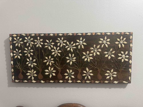 Mid-Century Bone and Mixed Metal Inlay Floral Wood Wall Plaque