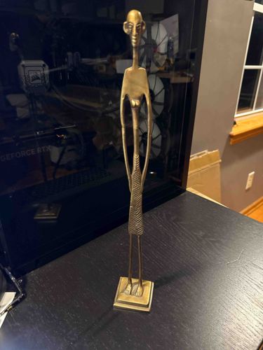 This item is a highly stylized, elongated female figure, likely of West African origin, specifically similar to the traditional lost-wax bronze casting styles of the Dogon or Bamana people. The statue is approximately 10 to 12 inches tall, crafted from a heavy bronze or brass alloy with a warm, golden-brown aged patina. The figure features extreme vertical elongation, with a slender neck, thin torso, and spindly limbs. The head is minimalist with prominent ears and subtle facial features. One of the most notable characteristics is the textured wrap or skirt around the lower torso, rendered with fine, horizontal incised lines. The figure is mounted on an integral square, tiered base that matches the metallic composition of the body. The craftsmanship reflects a traditional hand-casting method, evidenced by the slightly irregular surface textures and organic flow of the metal. Condition-wise, the statue appears well-preserved with a uniform surface age and no visible cracks or missing parts. This piece likely dates from the late 20th century, serving as a contemporary interpretation of ancient rhythmic sculpture traditions, and showcases high-quality decorative craftsmanship through its graceful proportions and balanced composition.