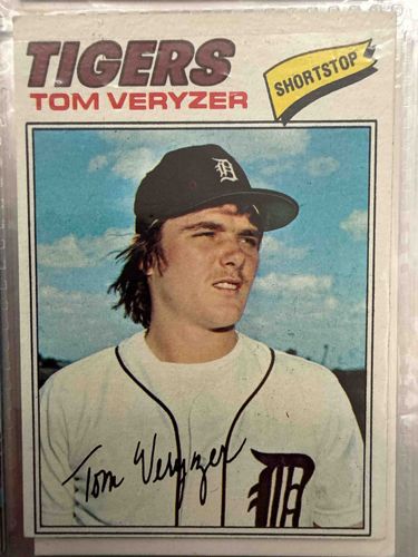 This is a 1975 Topps baseball card featuring Tom Veryzer, shortstop for the Detroit Tigers. The card measures approximately 2.5 by 3.5 inches and is printed on typical vintage mid-70s cardboard stock with a matte finish. The front features a portrait photo of Veryzer in his Tigers home uniform and cap against a sky background. The design is unique to 1975, featuring the team name 'TIGERS' in large block letters at the top left and the player's name below it. A distinctive yellow banner in the top right corner denotes his position as 'SHORTSTOP'. A facsimile signature 'Tom Veryzer' is printed in black ink across the bottom of the photo. Visible condition notes include a significant off-center cut characteristic of mid-70s Topps factory production, with very narrow borders on the right side and bottom. There is noticeable soft wear on the corners, particularly the top right, and slight surface scuffing visible on the print. The white borders show some light age-toning. Despite these flaws, the card lacks major creases or tears and remains in a protective plastic sleeve, preserving its historic value as a common card from a beloved vintage set.