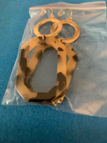 This pair of modern fashion earrings features a two-tiered geometric drop design. The upper portion consists of a polished gold-tone metal ring, likely made of a base metal alloy with an electroplated finish. Suspended from this ring is a larger, elongated octagonal hoop made of acrylic or cellulose acetate. This lower component displays a classic tortoiseshell or 'mottled' pattern, characterized by translucent amber and cream tones interspersed with dark brown or black spots. The earrings are constructed with traditional French hook (shepherd hook) ear wires, which appear to be fitted with plastic safety backings. The overall style is consistent with high-street fashion trends from the late 2010s to early 2020s. In terms of condition, the items are presented within a clear, resealable plastic poly bag, suggesting they are in new or lightly used condition with no visible scratches, tarnish on the metal, or cracks in the acrylic. The craftsmanship is typical of mass-produced costume jewelry, focusing on bold visual aesthetics and lightweight wearability rather than precious metal content or fine jewelry techniques.