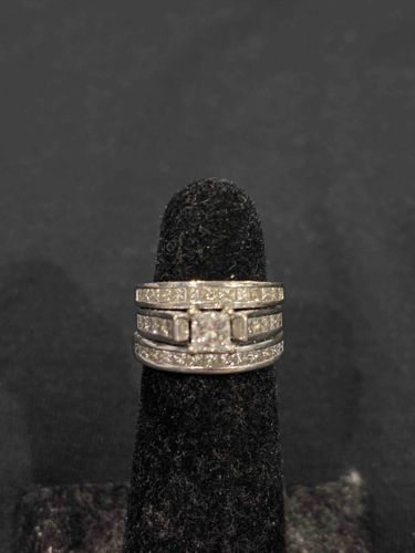 This is a contemporary bridal set featuring a central engagement ring flanked by two matching wedding bands, all crafted in 14k or 18k white gold. The engagement ring centers a princess-cut diamond held in a four-prong setting, flanked by channel-set princess-cut diamonds on the shoulders. The two coordinating bands are also channel-set with princess-cut diamonds, creating a continuous, high-brilliance look across the finger. The Tolkowsky hallmark is associated with the 'Ideal Cut' standards, suggesting high-quality stone selection with excellent light performance. The metal surfaces appear bright white, indicating a likely rhodium-plated finish. Each band features a tapered shank for comfort. The condition appears very good with no visible missing stones, though minor surface scratches and thinning of rhodium plating may be present on the underside of the bands due to normal wear. This architectural, channel-heavy style is characteristic of modern bridal designs from the 2000s and 2010s, emphasizing a clean-lined, geometric aesthetic.