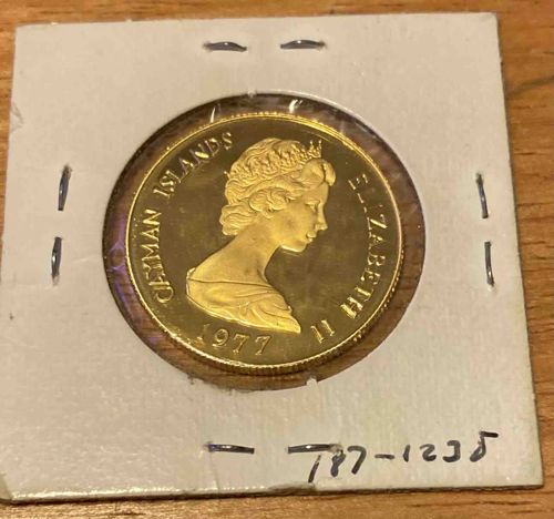 This is a 1977 Cayman Islands 50 Dollar commemorative gold coin, issued to celebrate the Silver Jubilee of Queen Elizabeth II. The obverse features the second official portrait of Queen Elizabeth II by Arnold Machin, showing her facing right wearing the ‘Girls of Great Britain and Ireland’ Tiara. The inscriptions along the rim read 'CAYMAN ISLANDS', 'ELIZABETH II', and the date '1977'. Structurally, the coin is composed of .500 fine gold (12 karats), with a total weight of approximately 2.3 grams and a diameter of 18mm. The coin exhibits a brilliant uncirculated or proof-like luster with high-relief strike quality typical of the Royal Mint. It is currently housed in a standard 2x2 cardboard and Mylar flip, which bears a handwritten inventory number '787-1235'. The physical condition appears excellent with sharp details on the hair and crown, though the plastic window of the holder shows some surface scratching and light dust. The reeded edge is clean, and there is no evidence of significant copper spotting or cleaning. This piece represents a significant modern numismatic collectible from the British Overseas Territory, minted during a period of high output for commemorative Commonwealth coinage.