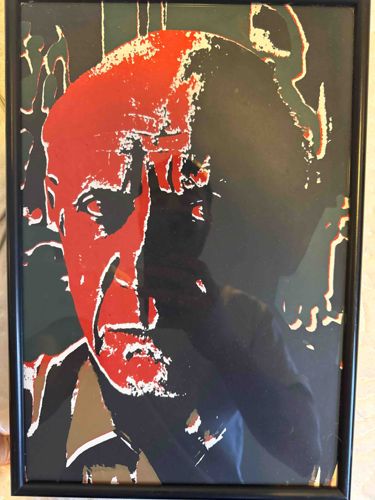 This item is a framed piece of contemporary wall art featuring a highly stylized, abstract portrait of a man, likely inspired by the Pop Art movement or posterized photography. The piece utilizes a dramatic tri-tone color palette consisting of vibrant red, deep black, and stark white highlights, with hints of khaki/grey tones in the lower sections. The composition relies on heavy shadows and high-contrast thresholding to define facial features, creating a gritty, urban aesthetic. The artwork appears to be a medium-sized print housed in a simple, slim black wooden or composite frame with a satin finish. The backing is protected by glazing, as evidenced by a prominent reflection in the photograph. Based on the construction and visual style, this piece likely dates from the late 20th century to the early 21st century. The condition appears to be fair, though there is a visible scratch or crease mark in the upper left quadrant of the print surface and some dust accumulation near the frame edges. No obvious artist signature or limited edition numbering is visible from the front view, suggesting it may be a decorative print rather than an original painting or numbered lithograph. The craftsmanship is commercial in nature, typical for modern home decor.