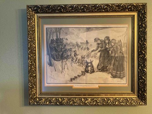 This is a large, framed monochrome illustration featuring anthropomorphic animals in a winter woodland scene, characteristic of the late Victorian or early Edwardian style associated with Louis Wain. The artwork depicts three women in era-appropriate long dresses and coats interacting with various forest creatures, including bears playing instruments and rabbits. The print is housed in a highly ornate, gilded rococo-style frame with deep relief scrolling acanthus leaf patterns. It is professionally matted with a sage green top mat and a thin inner gold accent mat. A notable vertical center crease suggests the image may have originally been a double-page spread from a periodical such as 'The Illustrated London News' or a similar Christmas annual. The paper shows age-appropriate yellowing or foxing across the surface. The frame appears to be in relatively good condition with some minor dust accumulation in the crevices of the gilding, consistent with moderate age. The overall composition displays a whimsical, narrative quality with detailed cross-hatching and shading techniques typical of 19th-century commercial lithography or engraving processes.