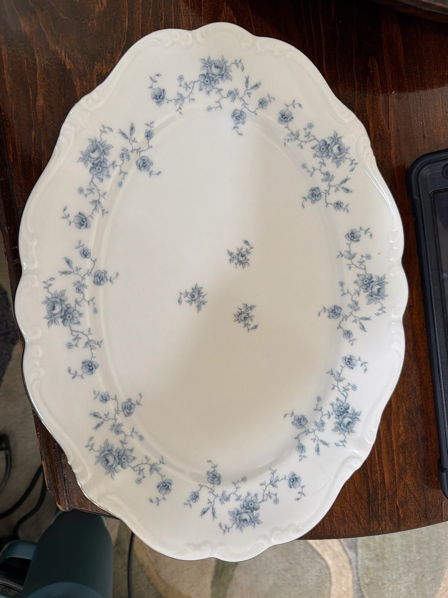 Maker: Johann Haviland • Origin: Bavaria, Germany • Size: ~13” × 9.5” (classic serving platter size) • Pattern: Blue/gray floral vine motif • Rim: Silver (platinum-tone) trim • Era: Likely 1960s–1980s