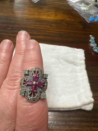 Italian Sterling Silver Marcasite Ring with Ruby and Emerald Accents