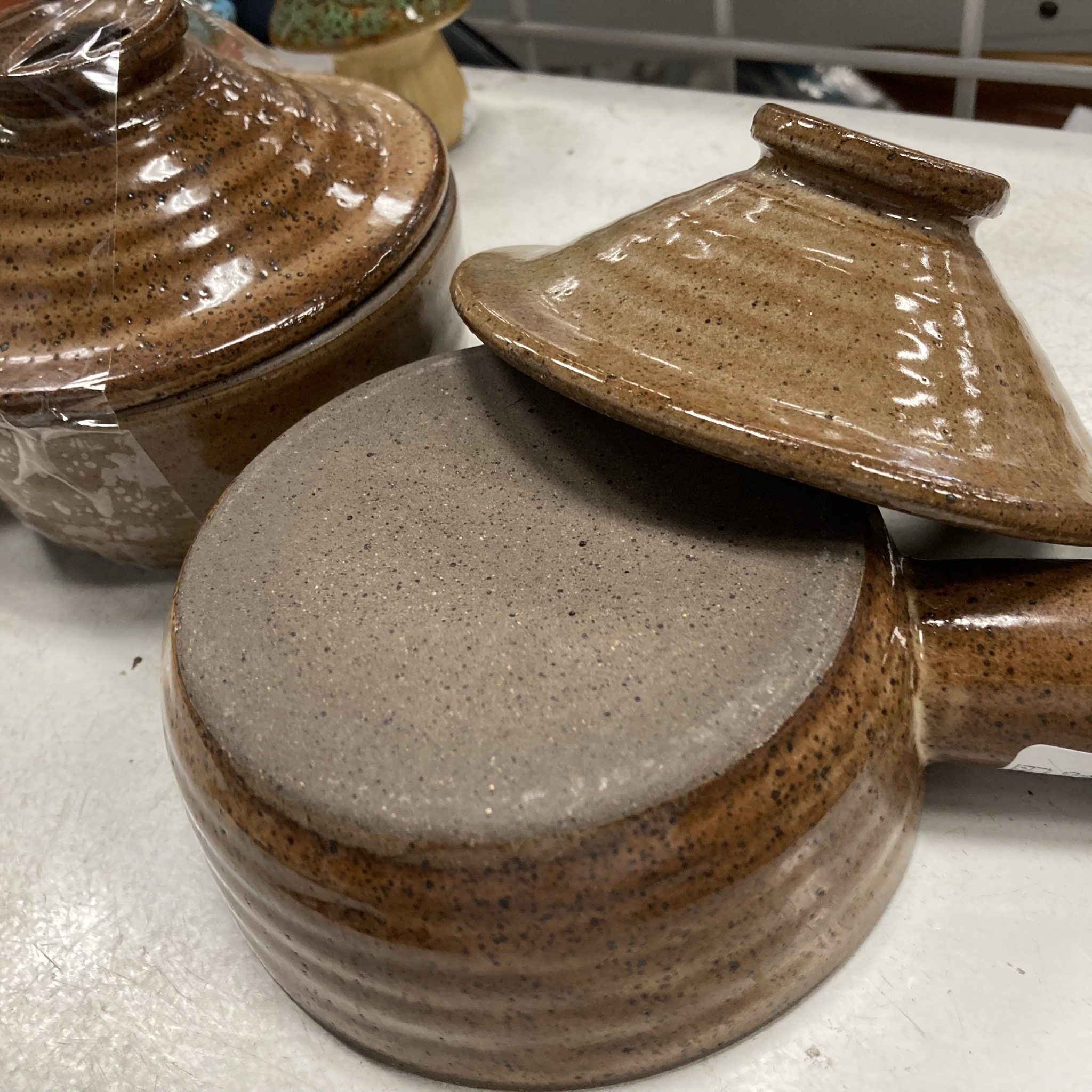This set consists of at least two handmade studio pottery lidded casseroles or individual serving bowls with handles. The items are fashioned from a heavy stoneware clay body. The exterior features a rich, warm brown speckled glaze with a glossy finish, likely a high-fire reduction glaze common in mid-century to modern studio ceramics. The bowls exhibit a distinctive ribbed or 'thrown' texture on the exterior walls, illustrating traditional pottery wheel construction. One bowl is inverted, revealing a flat, unglazed 'cookie' bottom where the raw, gritty clay texture is visible; this base shows a fine sand-like temper and consistent kiln firing. The lids are conical with stylized knob handles that double as rests when inverted. The handle of the dish is a sturdy, cylindrical projection typical of French onion soup crocks or individual bake-ware. Condition appears excellent with no visible chips, cracks, or significant crazing, though a thrift store price tag is partially visible on the handle. The aesthetic reflects a Late 20th Century studio pottery style, emphasizing functional rustic design and earth-toned glazes. There are no immediate signatures or maker's marks visible on the unglazed base in this view, suggesting they may be artisan pieces or part of a small-batch production line like those from the 1970s-1980s.