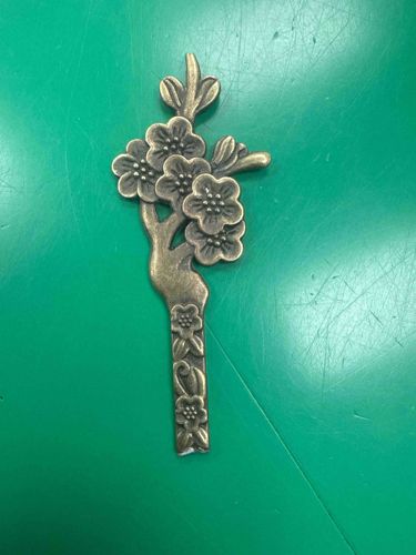 This item is an elongated decorative metal piece, likely a component for a traditional Japanese hair stick (kanzashi) or a costume jewelry brooch. It is cast from a base metal, possibly brass or a zinc alloy, and finished with an antique bronze or 'patinated brass' coating that highlights the recessed areas. The design features a cluster of four cherry blossom or plum blossom motifs at the top, each with five petals and a granulated center representing stamens. Above the blossoms is a small leaf-like finial. The stem or shank is uniquely decorated with further low-relief floral and scrollwork engravings, transitioning from a gnarled tree-branch texture to a more formal geometric pillar shape. In terms of condition, the piece shows significant wear at the bottom edge, where the decorative plating has chipped away to reveal a white/silver-toned base metal, suggesting it may have been snapped off from a longer pin or base. There is surface scratching consistent with age and handling. The style is reminiscent of mid-20th-century Asian revival accessories or contemporary 'steampunk' assembly parts. The craftsmanship is of moderate quality typical of mass-produced decorative hardware rather than high-end fine jewelry, as evidenced by some soft casting lines and the thinness of the plating.
