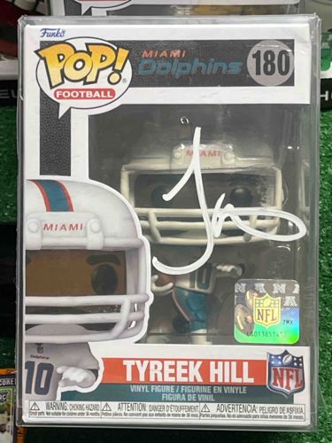 This item is a Tyreek Hill Funko Pop! vinyl figure, number 180 in the Football series, featuring the player in his Miami Dolphins home uniform. The figure is made of molded vinyl and is presented in its original retail window-box packaging, which is currently housed in a clear protective hard case or 'Pop protector'. The figure depicts Hill in an action pose, carrying a football and wearing a white Dolphins helmet with a teal and orange stripe. A significant feature is the bold white ink autograph on the front plastic window of the box. Additionally, an official NFL hologram authentication sticker is visible on the lower-right of the clear window (LA013851412). The box appears to be in good condition with sharp corners visible, though there is a minor white mark or residue on the upper-right corner of the front face. The packaging also bears standard manufacturer markings including the Funko brand logo and 'Pop! Football' series branding. This late-modern era collectible represents a key piece for sports memorabilia and Funko enthusiasts, particularly those following the Miami Dolphins franchise.
