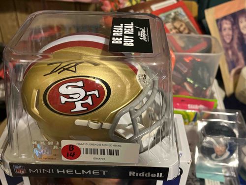 This is a Riddell Speed model mini football helmet featuring the official logo and colors of the San Francisco 49ers. The helmet features a metallic gold shell with the iconic red and white 'SF' oval logo decal on the side. It includes a grey facemask, detailed interior padding, and a white chin strap. Authenticated by a visible black ink signature on the top left of the gold shell, the item is labeled as being signed by Isaac Guerendo, despite the user's note suggesting Roddy White. The signature appears bold and is applied directly to the high-gloss plastic surface. The helmet is housed in its original clear acrylic display cube and cardboard base, featuring an official NFL holographic sticker and a 'Real. Be Real. Buy Real.' authentication sticker. The condition appears to be mint-in-package, with no visible scuffs to the gold paint or peeling of the decals. The packaging shows minor shelf wear but preserves the integrity of the collectible. This modern sports memorabilia piece represents high-quality craftsmanship intended for display and investment purposes, typical of contemporary player signings.