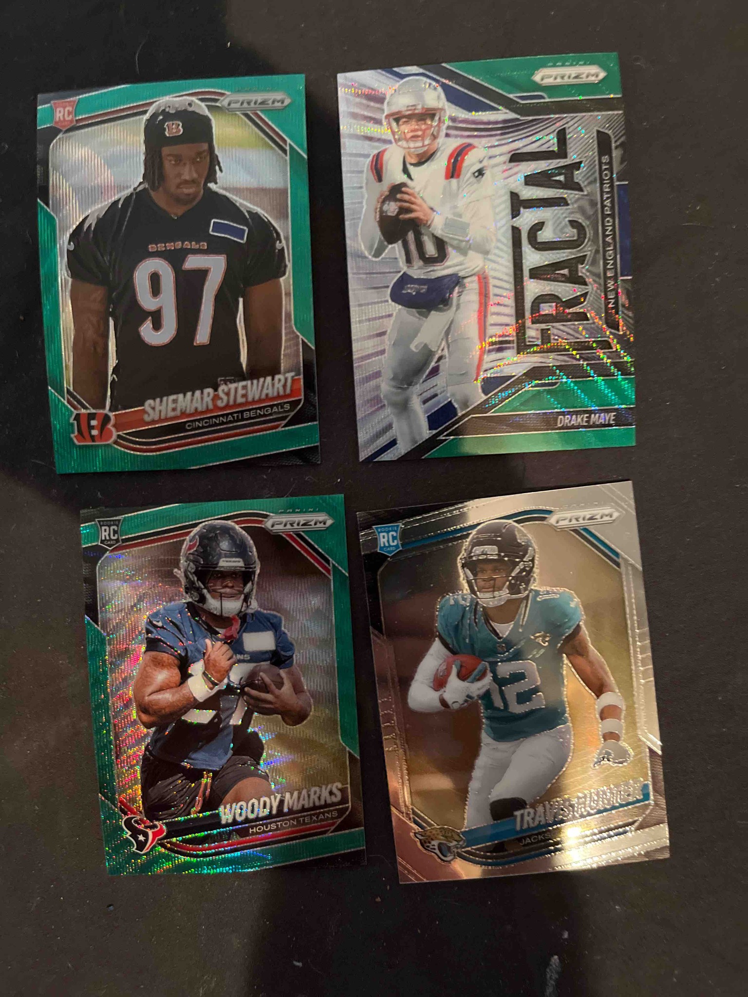 This set of four collectible sports cards features emerging football talent under the Panini Prizm brand. Specifically, the collection includes Shemar Stewart (Cincinnati Bengals), Drake Maye (New England Patriots) in a 'Fractal' insert, Woody Marks (Houston Texans), and Travis Hunter (Jacksonville Jaguars). Each card is standard 2.5 x 3.5 inches, constructed from thick premium cardstock with a high-gloss, reflective chrome finish. The Shemar Stewart and Woody Marks cards feature a green cracked-ice or pulsar-style parallel foil pattern, while the Drake Maye displays a specialized 'Fractal' holographic design. The Travis Hunter card is a base silver prizm. These cards prominently feature the 'RC' (Rookie Card) shield logo, indicating they are from the players' debut professional seasons. Visually, the cards show sharp corners and edges, though slight surface scratches or 'dimples' common in the Prizm chromium production process may be present. The centering on the Drake Maye card appears slightly shifted towards the right border. All cards exhibit the vibrant team-specific colors and high-definition photography characteristic of modern Panini Prizm releases, which are highly sought after by modern hobbyists for their rainbow of parallels and investment potential.