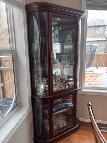 This is a two-tier, traditional-style curio cabinet featuring a distinctive curved or 'bow-front' design constructed from hardwood with a rich reddish-brown cherry or mahogany finish. The upper section consists of a tall display area with integrated lighting, glass shelving, and large curved glass side panels that flank a central hinged glass door. The lower section features a smaller matching storage compartment with a single glass door and curved side panels, mirroring the top's profile. Notable features include a prominent ogee-molded cornice at the crest and a matching tiered plinth base that provides structural stability. The glass appears to be tempered and held in place by wooden muntins. The hardware consists of small, ornate brass-toned pull handles centered on the doors. Condition appears to be very good with no visible chips in the glass panels; the wood finish shows high luster with only minor superficial scuffing near the base. The style suggests a late 20th-century manufacture, likely between 1980 and 2000, indicative of high-quality mass-market furniture production often seen from brands like Pulaski or Howard Miller. The precision of the curved glass and the seamless fit of the doors indicate expert craftsmanship and a focus on ornamental display functionality.