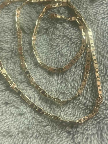 This item is a yellow gold chain necklace featuring a stylized Mariner or Anchor link design. The chain is constructed from flat, rectangular links with rounded corners, each featuring a central bar. A notable aesthetic feature is the alternating series of 'diamond-cut' starburst or sunburst patterns engraved onto the surface of every few links, which provides enhanced light reflection and brilliance. The metal exhibits a warm yellow hue consistent with 10k or 14k gold, though no visible hallmark is identifiable in the image to confirm the exact purity. The craftsmanship indicates modern industrial manufacturing, likely dating from the 1990s to the present. Physically, the chain appears to be in excellent condition with no visible kinks, broken links, or significant abrasions. The links are uniform in size and the diamond-cutting remains sharp, suggesting minimal wear. The piece lacks a visible clasp in this view, making it impossible to determine the closure type, such as a lobster claw or spring ring. Its style is contemporary and versatile, falling into the category of fine jewelry staples.