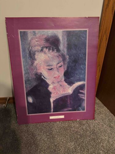 This item is a decorative art print on a matted backing board, depicting the famous 19th-century Impressionist painting 'Young Girl Reading' (also known as 'La Lecture') by Pierre-Auguste Renoir. The print showcases Renoir’s signature soft-focus style, featuring a young woman with blonde hair, dressed in dark attire with a ruffled pink and white collar, deeply engrossed in a book. The color palette is dominated by muted blues, purples, and soft flesh tones, typical of the Impressionist movement. The print is mounted within a wide, dark magenta or plum-colored border that functions as an integrated mat. A small rectangular white label is centered at the bottom of the border, likely containing the artist’s name and work title. The physical condition shows significant wear, including creasing and crushing at the top right and top left corners, as well as several nicks and scuffs along the outer edges of the cardboard backing. This is a mass-produced modern reproduction rather than an original lithograph or fine art edition, intended for home decor. The craftsmanship reflects standard commercial printing techniques on heavy paper or cardstock.