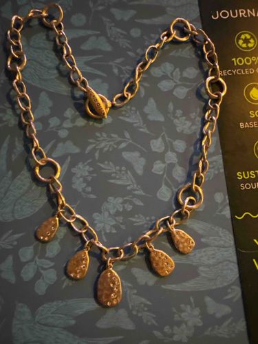 This is a contemporary fashion necklace featuring a heavy-gauge oval link chain constructed from a base metal, likely pewter or silver-toned brass, with a warm-toned satin or matte finish. The focal point of the piece is the front section, which features five suspended teardrop-shaped charms. Each charm exhibits a distinct dimpled or 'hammertone' texture, providing a handcrafted, organic aesthetic. The central drop is slightly larger than the surrounding four, creating a balanced, tapered silhouette. The necklace is secured with a prominent toggle-and-ring clasp. Importantly, the toggle bar carries the engraved maker's mark 'Sigrid Olsen', identifying it as a piece from the lifestyle brand's jewelry line, likely dating from the early to mid-2000s. The construction shows solid craftsmanship with secure jump rings connecting the drops. The condition appears to be excellent vintage/pre-owned, showing a soft patina consistent with light wear but no visible signs of metal fatigue, heavy scratches, or plating loss. Its style is characteristic of the 'Boho-chic' or 'Artisan' aesthetic popular in upscale department store lines during its era of production.