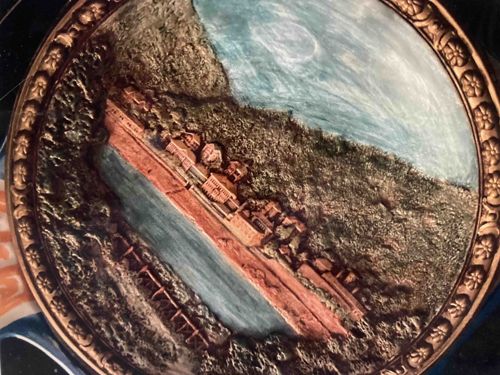 This item is a circular ceremonial or decorative plate featuring a detailed high-relief (repoussé) landscape scene, likely crafted from copper or a similar malleable metal alloy. The central imagery depicts a coastal or riverside architectural settlement tucked against a rugged, texture-heavy hillside. The piece is hand-painted with a palette of teals for the water and sky, terracotta tones for the buildings and paths, and muted greens for the foliage. The construction shows a labor-intensive technique where the metal was hammered from the reverse to create a three-dimensional effect. The plate is encased in a decorative border featuring repeating floral or rosette motifs, characteristic of mid-20th-century folk or artisanal metalwork. Notable features include the heavy impasto-like texture and the specific signing noted as 'G E S' dated April 28, 1972, which identifies it as a specific studio piece from the early 1970s. The condition appears fair to good, with visible oxidation and minor surface wear consistent with age, though the paint remains largely intact. The craftsmanship suggests an individual artist's work rather than mass production, emphasizing a rustic, tactile aesthetic typical of the period's decorative arts movement.